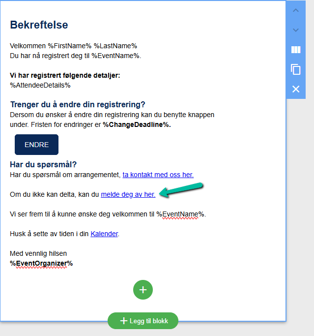 Se forslag under, her har vi lagt inn flettekoden %LinktoCanNotAttend% og hyperkoblet det vi ønsker skal være klikkbart for avmelding: