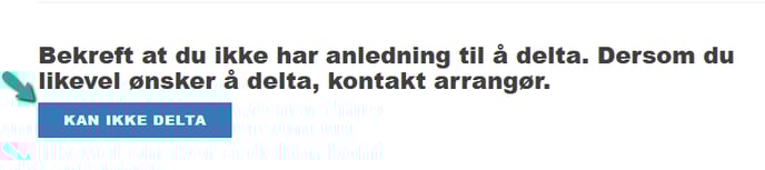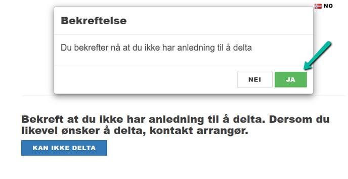 Deltakeren må bekrefte avmeldingen ved å klikke på Kan ikke delta knappen, og enda et nytt vindu kommer opp som ber deltakeren om å endelig bekrefte sin avmelding ved å klikke JA.