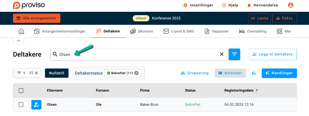 Leter du etter et bestemt firma for å se hvem som er påmeldt fra det firmaet, søker du på hele eller deler av firmanavnet. Et annet tips kan være å sortere etter firmanavn og lete det opp der.