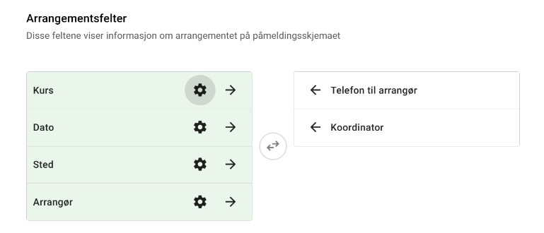 Vil du for eksempel at det skal hete Kurs isteden for Arrangement, slik som under, går du til innstillinger og endrer ordlyden der. Dette kan du gjøre i alle arrangementsfeltene, men husk at disse flettes inn mange steder (e-post bekreftelser, invitasjoner sms, app osv) så det er viktig å bruke feltene til det de skal brukes til.