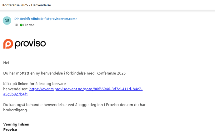 For at svaret skal bli sendt både til deltaker som har spurt, og bli loggført i Proviso under Henvendelser, er det viktig å svare ved å klikke seg inn på lenken i e-posten.