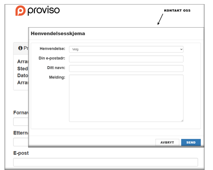 På påmeldingsskjema ser vi Kontakt oss på toppen av skjema, og ved å klikke på denne får man opp henvendelsesskjema som fylles inn og spørsmål sendes til arrangør: