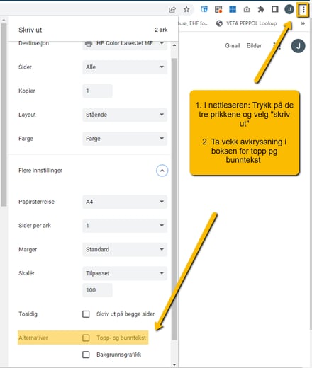 Hvis du får topp og bunnlinjene som vist under må du inn på utskriftsinnstillingene i Google chrome.